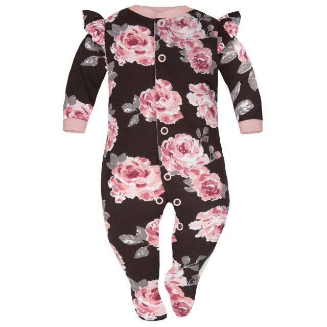 Pajacyk niemowlęcy to niezastąpione ubranko w garderobie każdego niemowlaka. Bawełniany pajac nie krępuje ruchów dziecka, świetnie sprawdza się zarówno podczas zabaw w ciągu dnia jak również jako piżamka w ciągu nocy. Wzór w piękne duże róże na brązowym tle, z uroczymi falbankami na ramionach, idealny dla małej dziewczynki. Pajac wykończony jest różowymi, mięciutkimi ściągaczami, posiada pełne, zakryte stópki. Pajacyki w większych rozmiarach posiadają na stopach antypoślizgowy nadruk abs.