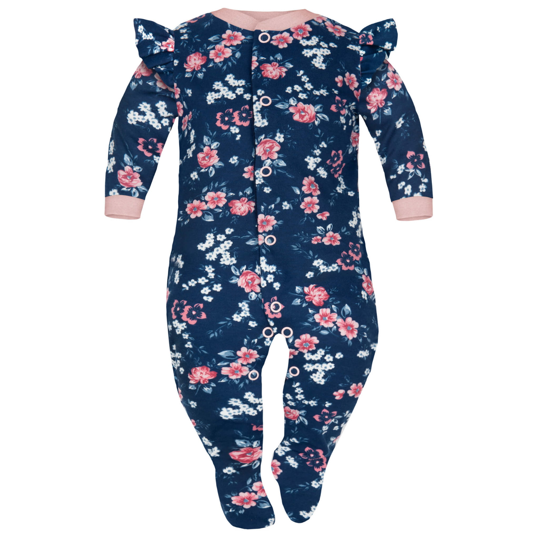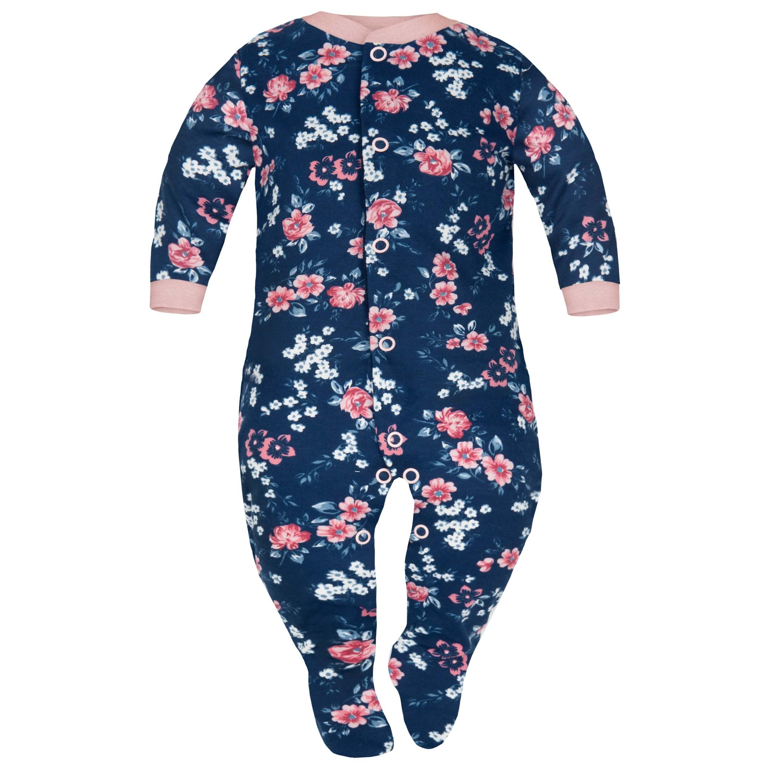 Pajac dla niemowląt w śliczne drobne różyczki na granatowym tle, wykończony różowymi delikatnymi ściągaczami przy rączkach oraz przy szyjce Maluszka. Wzór z kolekcji "Retro Style" od polskiego producenta Dolce Sonno. Pajac stanowi samodzielne ubranko na co dzień jak również świetnie sprawdza się jako piżamka podczas snu niemowlaka. Pajace dostępne są w rozmiarach od 56 do 92 cm.