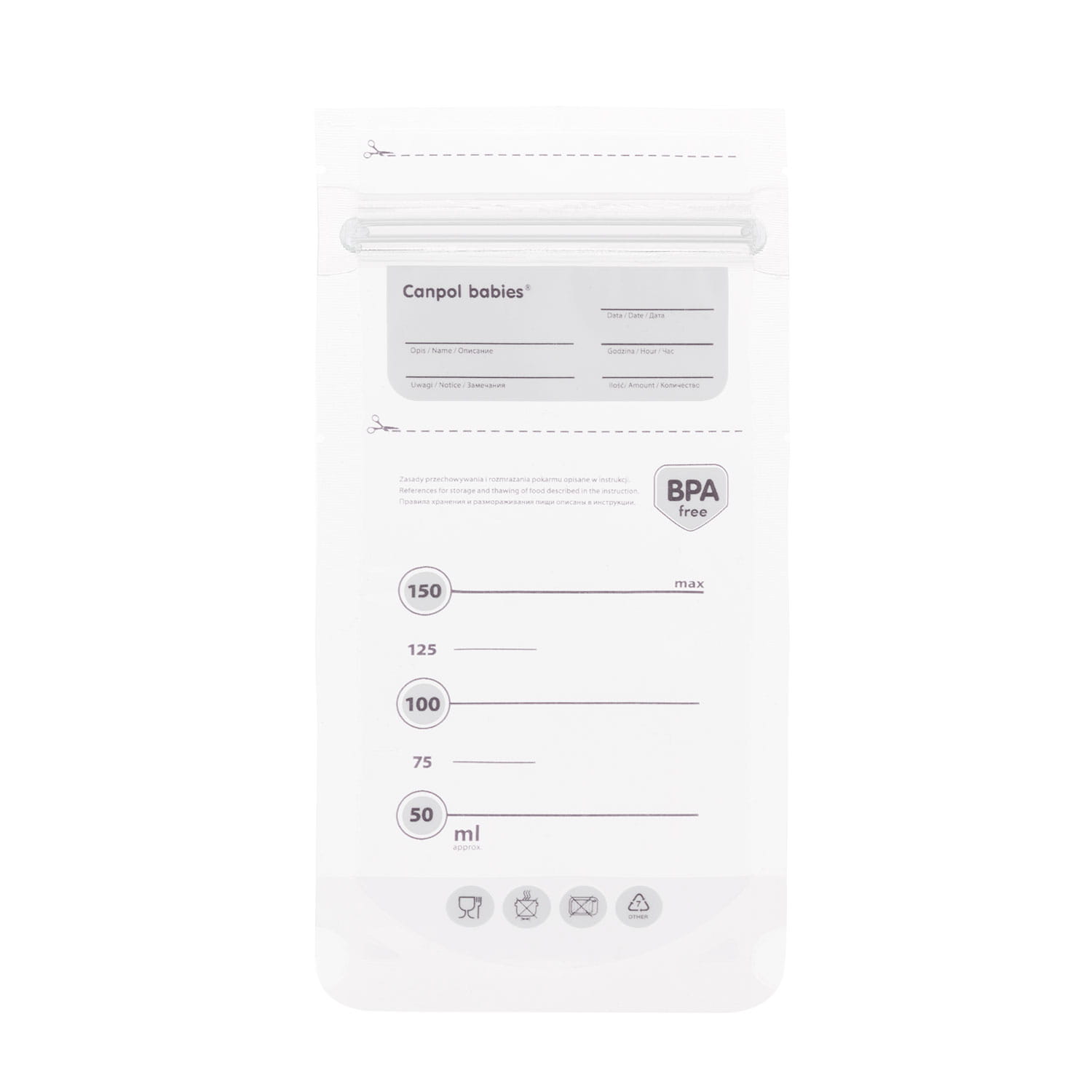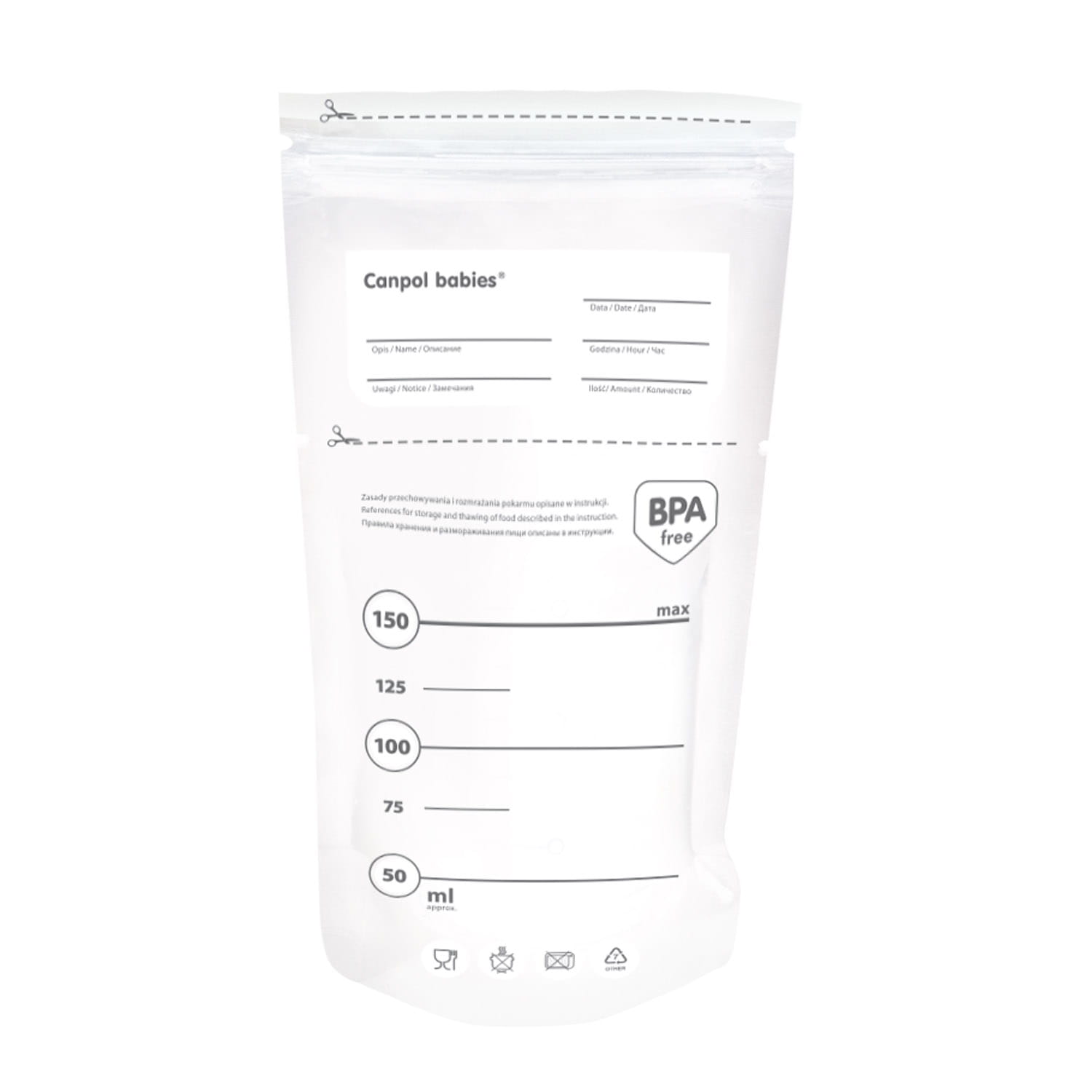 Praktyczne woreczki umożliwiają długotrwałe przechowywanie pokarmu utrzymując jego wysoką jakość. Konstrukcja woreczka ułatwia postawienie go w pozycji pionowej bez ryzyka rozlania. Każdą torebkę poddano dokładnej sterylizacji, co zapewnia utrzymanie wysokiej jakości pokarmu. W zestawie są samoprzylepne etykiety, na których można zapisać termin przydatności mleka. Woreczki wykonano z wysokiej jakości materiału przeznaczonego do kontaktu z żywnością. W opakowaniu znajduje się 20 torebek o pojemności 150ml.