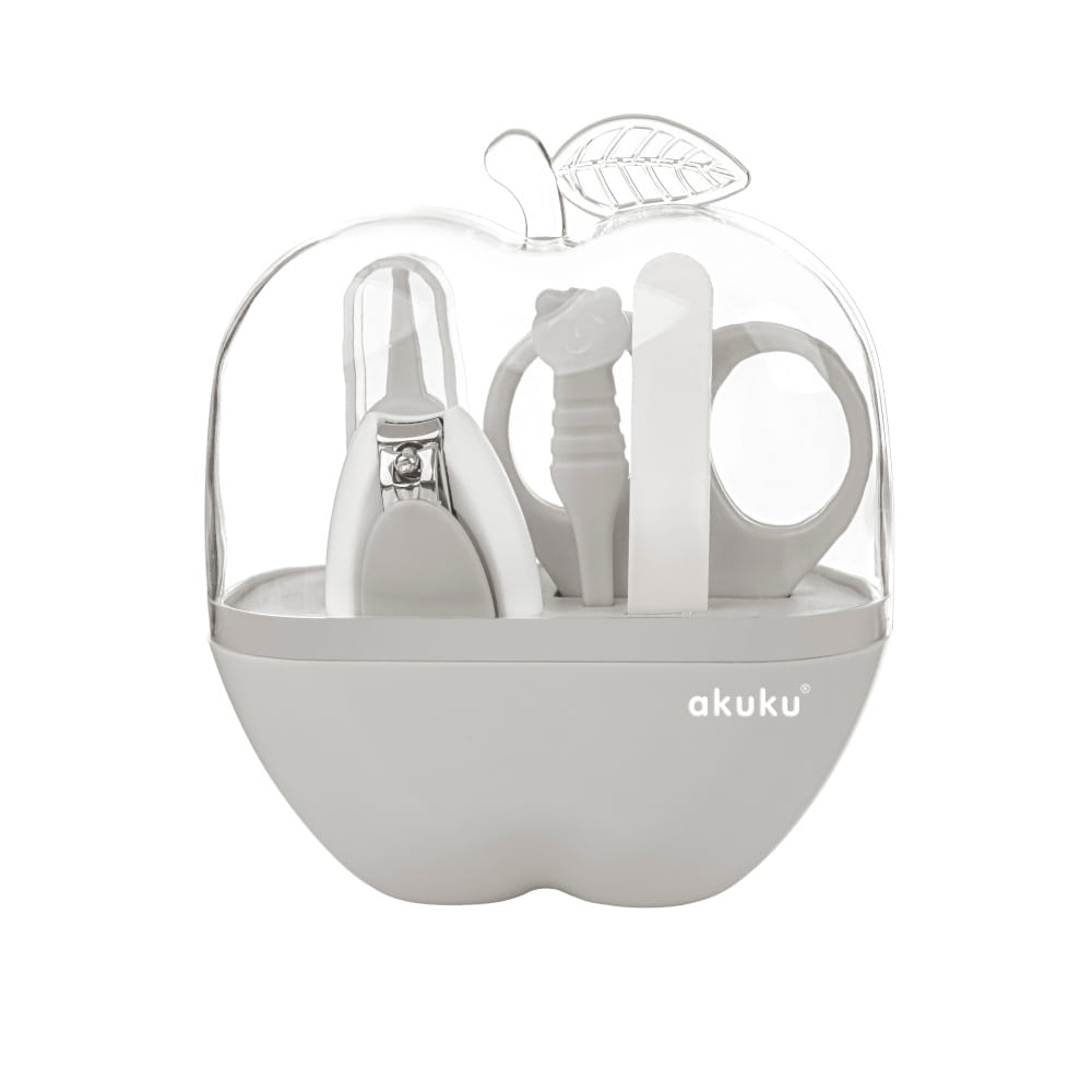 Zestaw do pielęgnacji malutkich paznokci niemowlaka. Praktyczny, poręczny komplet do manicure dla najmłodszych. W zestawie w kolorze szarym, znajdują się bezpieczne nożyczki ze stali nierdzewnej , z zaokrąglonymi końcówkami , pilniczek szklany oraz dwie pincety, wszystko zapakowane w eleganckie stojące etui w kształcie jabłuszka. Doskonałe na prezent oraz przy kompletowanie wyprawki dla noworodka. Zestaw do paznokci idealnie sprawdzi się zarówno w domu jak i w podróży.