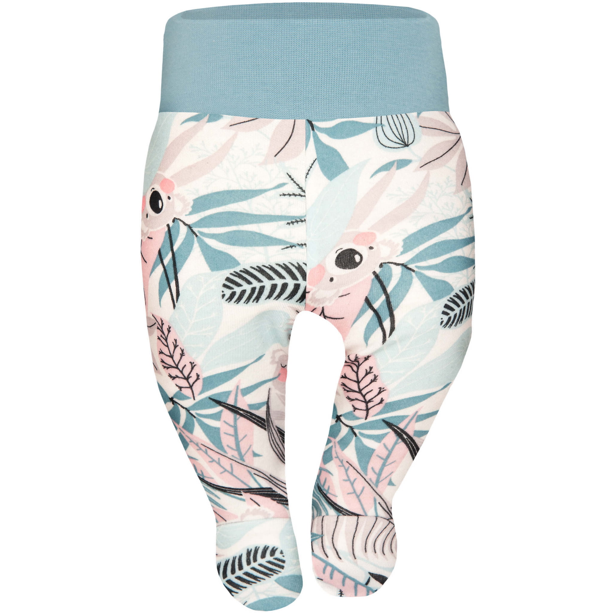 Półśpiochy niemowlęce z szerokim bezuciskowym ściągaczem z motywem dzikiej dżungli z seledynowym ściągaczem. Świetnie sprawdzą się w połączeniu z body niemowlęcym zapinanym w kroku oraz kaftanikami i bluzeczkami. Półśpiochy to wygodne spodenki z pełnymi stópkami, idealne ubranko dla noworodków i najmłodszych niemowlaków gdyż nie posiadają żadnych ekspresów i guzików, które mogłyby uwierać Maluszka oraz zapewniają szybki dostep do pieluszki.