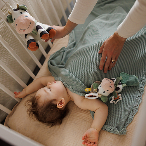 Wystarczy delikatnie pociągnąć za kółeczko, aby uruchomić spokojną melodię, która pomaga dziecku się zrelaksować i zasnąć. Krówka towarzyszy maluchowi w codziennych rytuałach, budując poczucie bezpieczeństwa i bliskości.