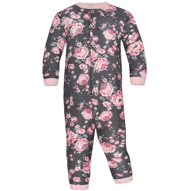 Pajacyk bez stópek z delikatnej bawełny w kwiaty na grafitowym tle. Rampersy niemowlęce rozpinane są po całej długości na bezpieczne napy, dzięki czemu zakładanie ubranka oraz wymiana pieluszki jest niezwykle wygodna i komfortowa. Rampers przy szyjce oraz wokół rączek i nóg został wykończony nieuciskającymi ściągaczami.