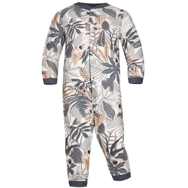 Rampers niemowlęcy uszyty z wyjątkowo miękkiej i elastycznej bawełny z motywem dzikiej dżungli i misiami koala. Wykończony delikatnym grafitowym ściągaczem, rozpinany na bezpieczne bezniklowe napy. Pajac stanowi samodzielne ubranko. Świetnie sprawdza się podczas zabaw w trakcie dnia, jak również jako piżamka w ciągu nocy. Rampersy w przeciwieństwie do pajaca posiadają odkryte stópki.