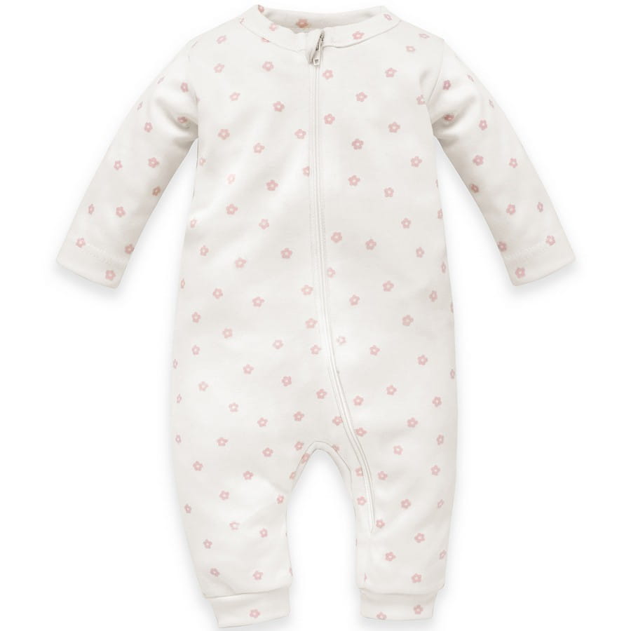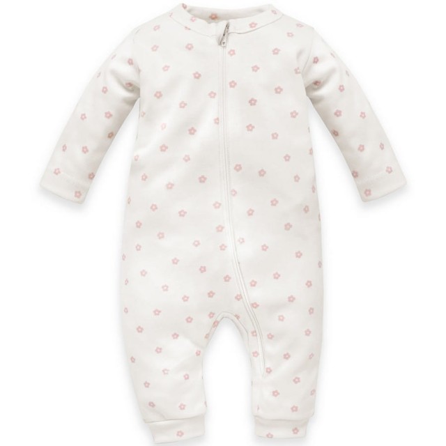 Rampers z długim rękawem zapinany na zamek błyskawiczny z kolekcji "Lovely Day", wykonany w 100% z certyfikowanej bawełny w kolorze ecru w jasnoróżowe kwiatki. To ubranko dla niemowląt, to doskonały wybór dla rodziców ceniących wygodę i klasyczne rozwiązania w garderobie swojego Maluszka.
