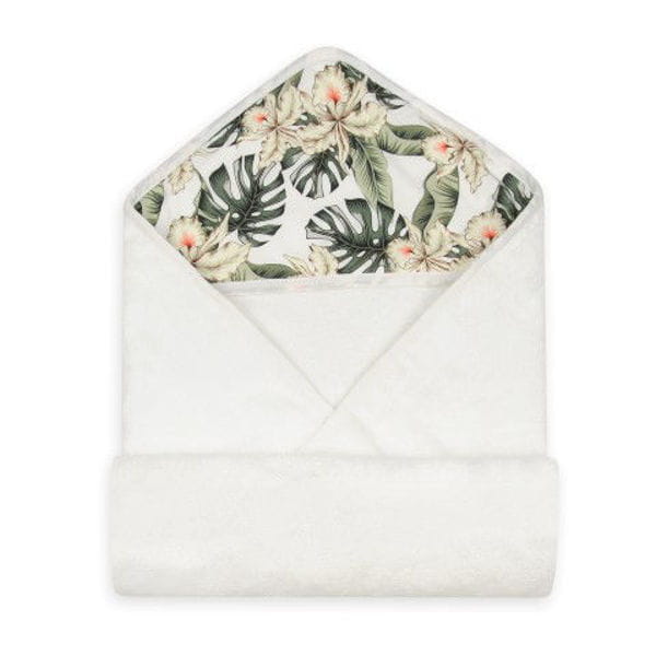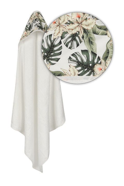 Duże okrycie kąpielowe z kapturem w rozmiarze 100x100 cm. Ręcznik z kapturem to niezbędny element wyprawki niemowlęcej. Tkanina bambusowa doskonale chłonie nadmiar wody, a kaptur chroni główkę dziecka przed przeciągami. Ręcznik w kolorze białym z ozdobnym printem w liście. Ręcznik zapakowany jest w ozdobne eko pudełko z okienkiem więc doskonale nadaje się na prezent dla przyszłych rodziców oraz ich Maluszka.