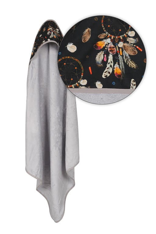 Duży ręcznik z kapturem w rozmiarze 100x100 cm. Okrycie kąpielowe z kapturem to niezbędny element wyprawki niemowlęcej. Tkanina bambusowa doskonale chłonie nadmiar wody, a kaptur chroni główkę dziecka przed przeciągami. Ręcznik w kolorze grafitowym z ozdobnym printem. Ręcznik zapakowany jest w ozdobne eko pudełko z okienkiem więc doskonale nadaje się na prezent dla przyszłych rodziców oraz ich Maluszka.