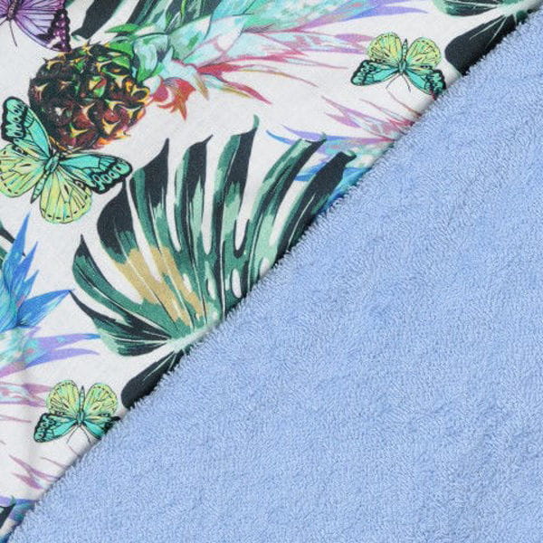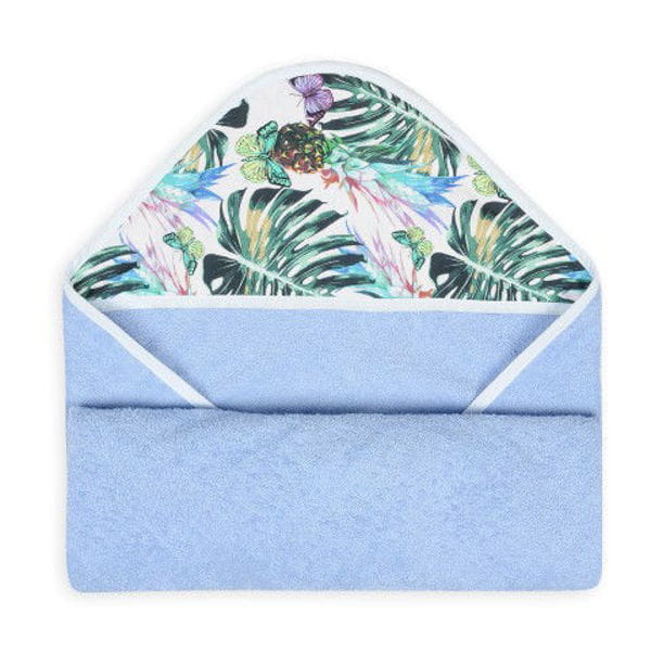 Bawełniane okrycie kąpielowe z kapturem dla chłopca. Obszerny ręcznik z kapturem to niezbędny element wyprawki niemowlęcej, jest niezastąpiony tuż po kąpieli gdyż chroni delikatną główkę dziecka przed przewianiem. Tkanina bawełniana doskonale chłonie nadmiar wody i przyjemnie otula Maluszka. Ręcznik w kolorze niebieskim z ozdobnym printem w kwiaty.