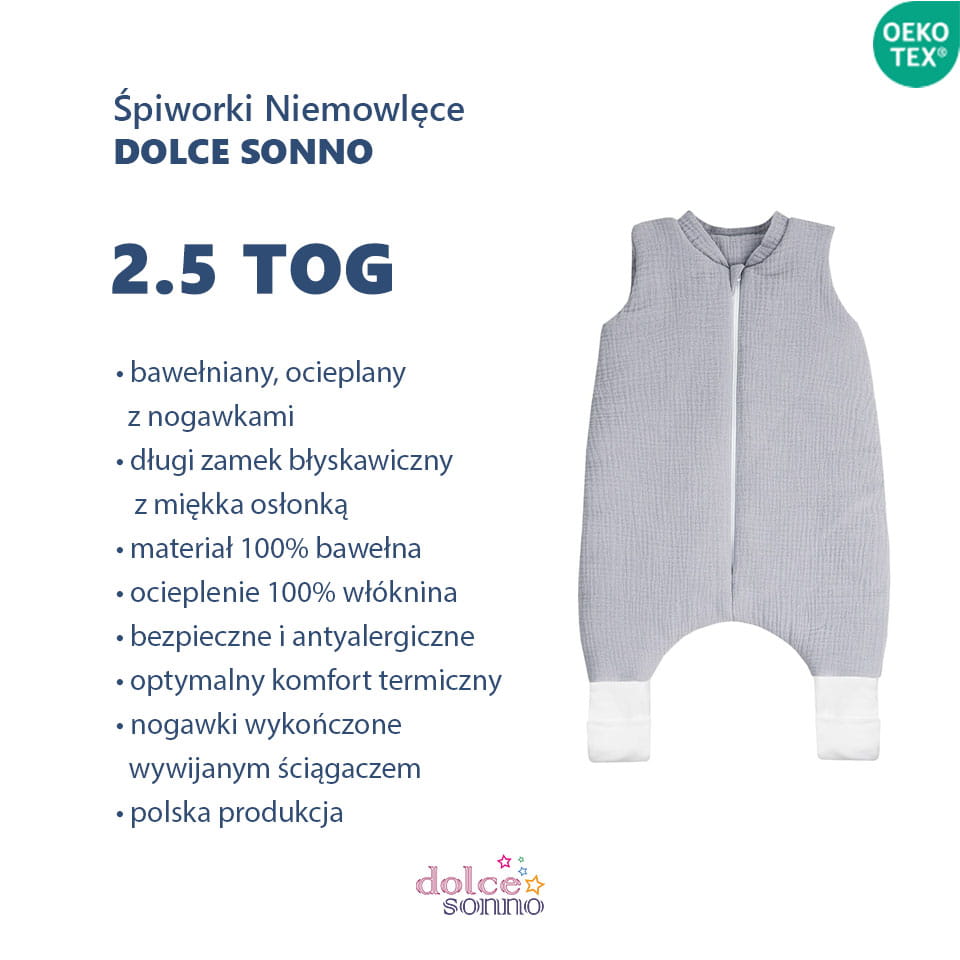 Całoroczny śpiworek muślinowy 2,5 TOG – gwarancja komfortu i bezpieczeństwa dla Twojego dziecka | Szary Dolce Sonno
