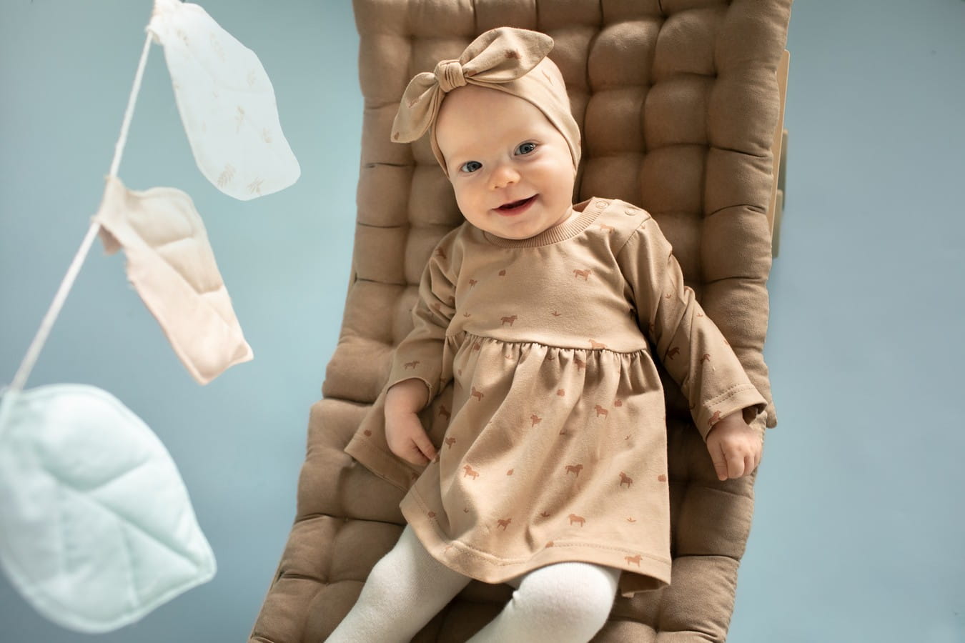 Z przemyślanym krojem, dostosowanym do anatomii dzieci, sukienka jest wygodna zarówno dla młodszych, jak i starszych dzieci. Zapięcie na ramionku do rozmiaru 86 ułatwia jej ubieranie. Napy bez zawartości uczulającego niklu zapewniają bezpieczeństwo dla skóry dziecka. Dodatkowo, ściągacz przy szyi ułatwia zakładanie sukienki przez głowę.